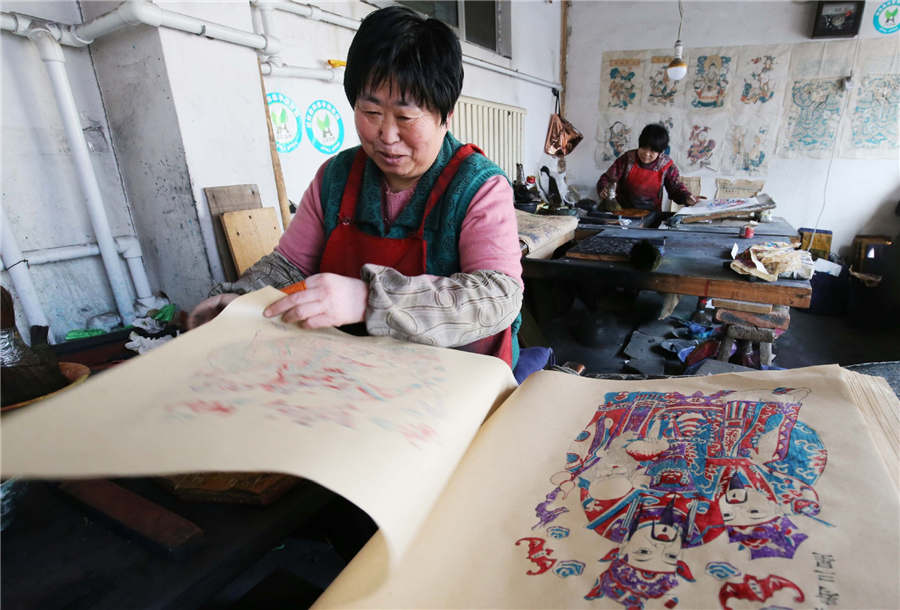 Folk artists print New Year pictures in Yangjiabu village of Hanting district in Weifang, East China's Shandong province, Jan 29, 2018, to cope with the demand of festival market. [Photo/Xinhua]