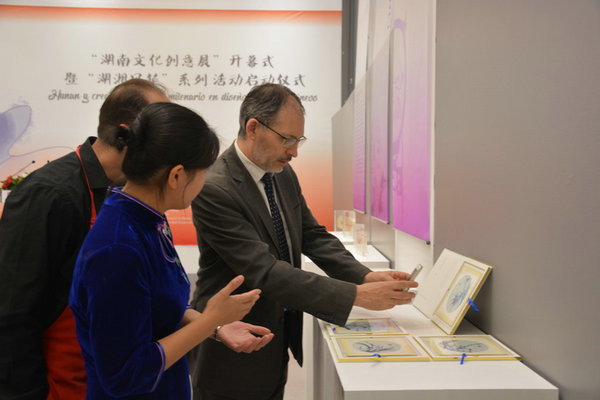 On the evening of Jan 29, the launch ceremony of 2018 Happy Chinese New Year celebrations and the opening ceremony of the Creative Exhibition of Hunan Culture were held at the China Culture Center in Madrid. Luo, Méndez de Vigo and Lv cut the ribbon at the ceremony to kick off the global celebrations of 2018 Happy Chinese New Year.