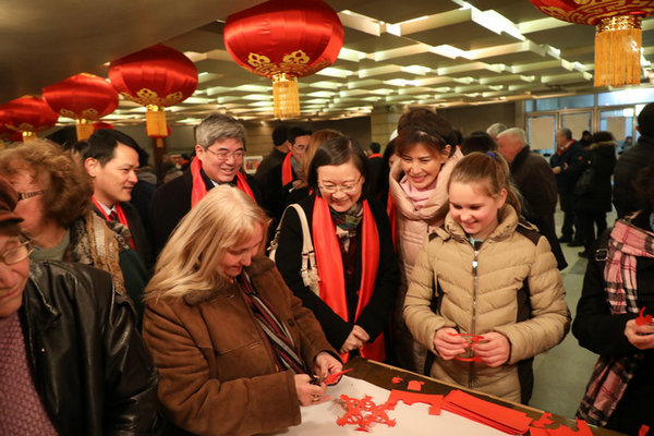Guests try paper-cutting at the Konstantin Musical-dramatic Theater in Veliko Tarnovo, Bulgaria, Jan 28, 2018. [Photo/Chinaculture.org]