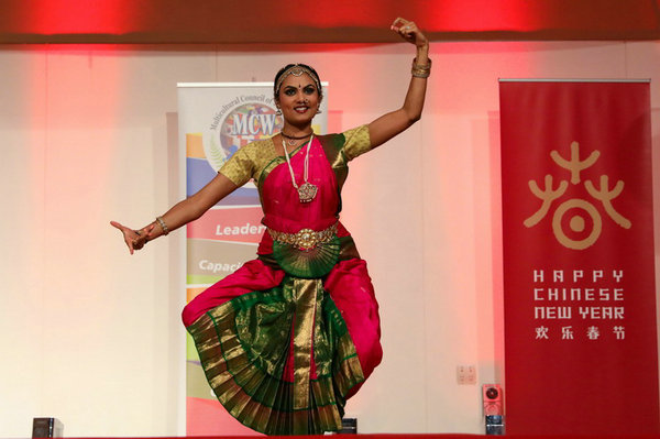 A dancer performs an Indian dance at the opening ceremony of the 2018 Happy Chinese New Year celebration at the Pipitea Marae & Function Centre in Wellington, New Zealand, Jan 30, 2018. [Photo/Chinaculture.org]