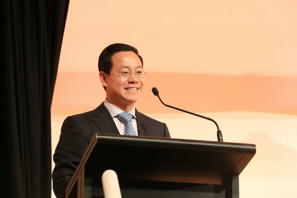Qu Guangzhou, the charge d'affaires of the Chinese Embassy to New Zealand, addresses the opening ceremony of the 2018 Happy Chinese New Year celebration at the Pipitea Marae & Function Centre in Wellington, New Zealand, Jan 30, 2018. [Photo/Chinaculture.org]