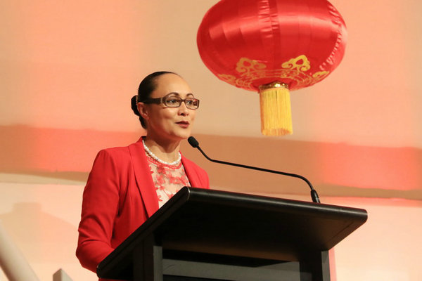 Jenny Salesa, minister for Ethnic Communities in New Zealand, speaks on behalf of the New Zealand government and extends her best wishes for the Chinese Lunar New Year at the opening ceremony of the 2018 Happy Chinese New Year celebration at the Pipitea Marae & Function Centre in Wellington, New Zealand, Jan 30, 2018. [Photo/Chinaculture.org]