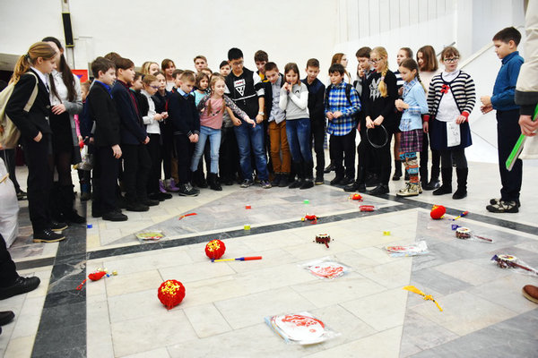 Belarusian children take part in a game to win Chinese cultural souvenirs at the 2018 Happy Chinese New Year temple fair in Minsk on Feb 1, 2018. [Photo/Chinaculture.org]