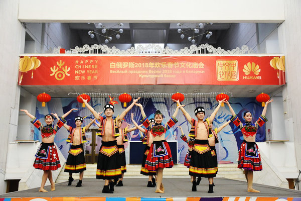 The art troupe from Central China's Hunan province stage a show featuring dancing and acrobatics at the 2018 Happy Chinese New Year temple fair in Minsk on Feb 1, 2018. [Photo/Chinaculture.org]
