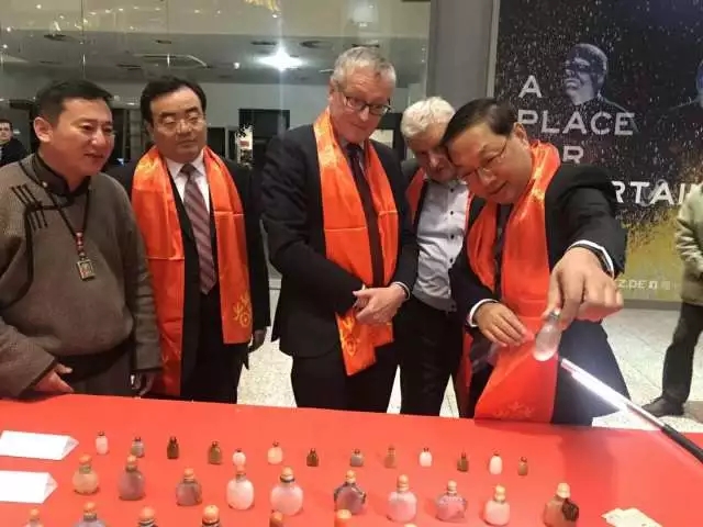 German and Chinese officials view the exhibition of Mongolian handicrafts in Berlin, Germany on Feb 1, 2018. [Photo/cri.cn]