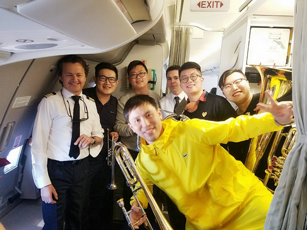 Five young Chinese musicians from Zhejiang province gave a surprise to passengers on a flight to Madrid, Spain, Jan 31.
