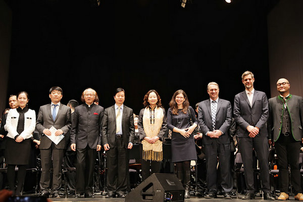 Mao Jingqiu (center), Chinese counsel general in Munich and Chen Ping (second from left), cultural counselor of the Chinese Embassy in Germany pose for a group photo with other guests after the Happy Chinese New Year concert at the Deutsches Theater in Munich on Jan 31, 2018. [Photo/Chinaculture.org] |
