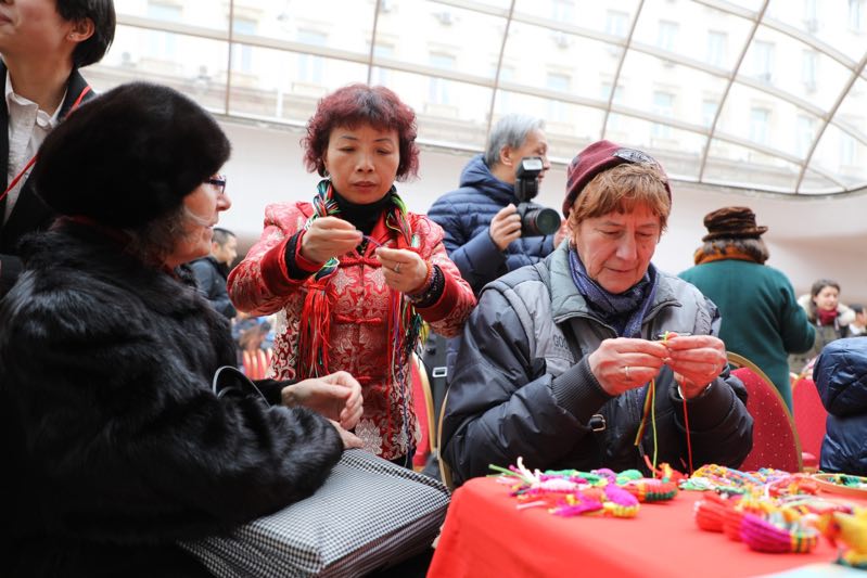 Participants try their hands at Chinese knotting. [Photo provided to China Daily] |