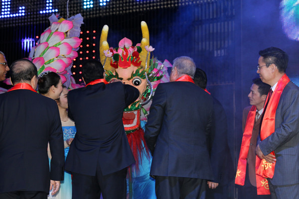 Officials from China and Egypt draw the dragon's gaze before the dragon dance in Sharm EI Sheikh, Egypt on Feb 9. [Photo by Gan Hongwei]
