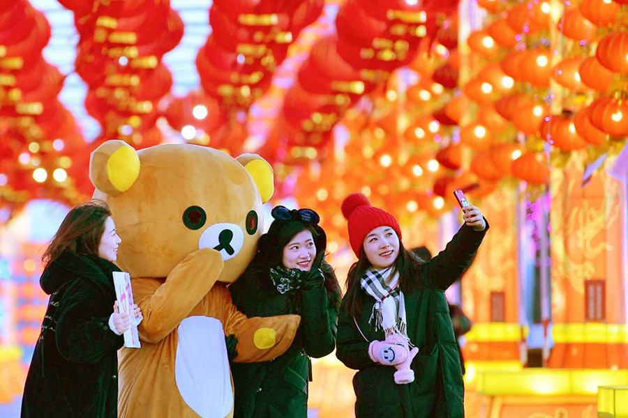 Visitors pose for a photo at a lantern show in Hebei province. [Photo by Dong Jun/China Daily] |