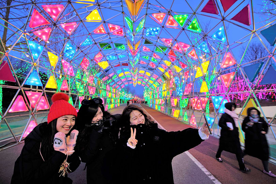 Visitors pose for a photo at a lantern show in Hebei province. [Photo by Dong Jun/China Daily]