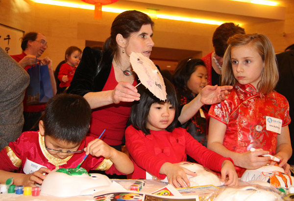 Miriam Mintzer from Maryland holds a paper umbrella while her adopted son, Eli, (seated, left) and other children paint masks at the Chinese Embassy in Washington, on Feb 12, 2018. A Chinese New Year reception was held there for American families who have adopted Chinese children. The event was supported by the Cradle of Hope Adoption Center and the Barker Adoption Foundation in the United States. [Photo by Zhao Huanxin / China Daily] |