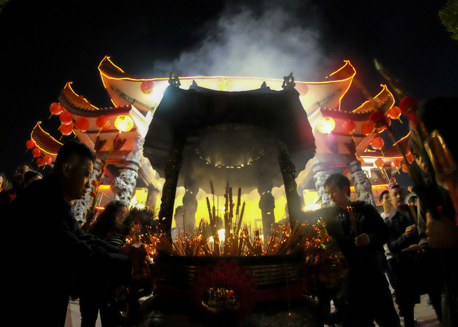 People burn incense at the Thien Hau Temple to celebrate the first day of Chinese Lunar New Year in Los Angeles, the United States, Feb 16, 2018. [Photo/Xinhua]