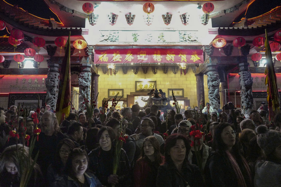 People gather at the Thien Hau Temple to celebrate the first day of Chinese Lunar New Year in Los Angeles, the United States, Feb 16, 2018. [Photo/Xinhua]