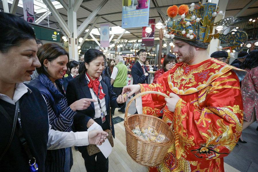 An airport staff member distributes sweets inside the airport terminal at the Vancouver International Airport in Richmond, Canada, Feb 16, 2018. Vancouver International Airport organized a wide range of performances to celebrate the Spring Festival with travellers. [Photo/Xinhua]