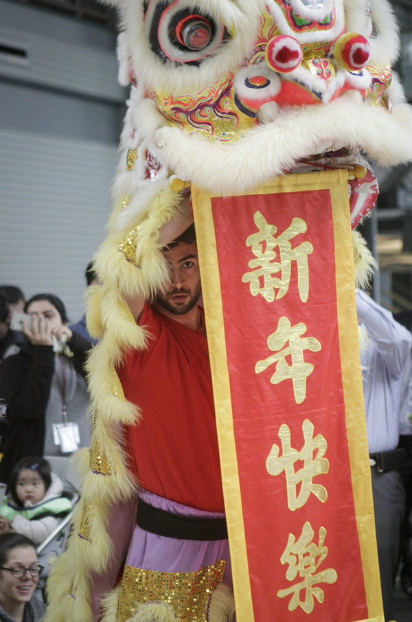 A man performs lion dance inside the airport terminal at the Vancouver International Airport in Richmond, Canada, Feb 16, 2018. Vancouver International Airport organized a wide range of performances to celebrate the Spring Festival with travellers. [Photo/Xinhua]