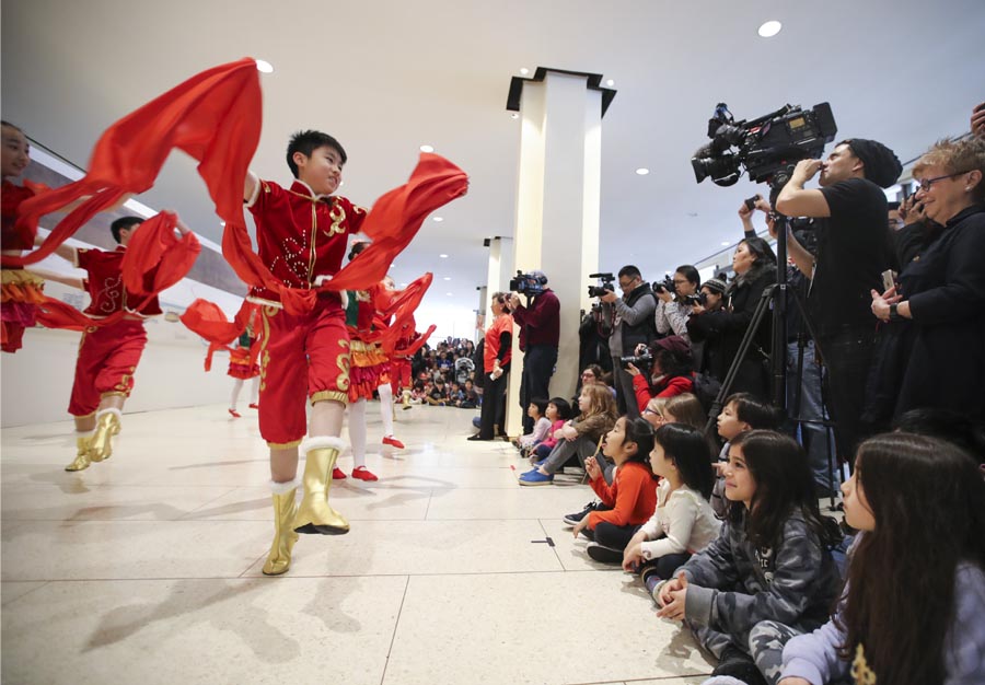 Teenage dancers from China and US perform during the students open day of "Happy Chinese New Year: Fantastic Art China" in New York, the United States, Feb 16, 2018. An open day of "Happy Chinese New Year: Fantastic Art China" was held here on Friday, the first day of Chinese lunar year of the Dog, to provide students and residents in New York an opportunity to learn and experience Chinese culture. The Chinese Lunar New Year becomes an official holiday in public schools in New York since 2016. [Photo/Xinhua]