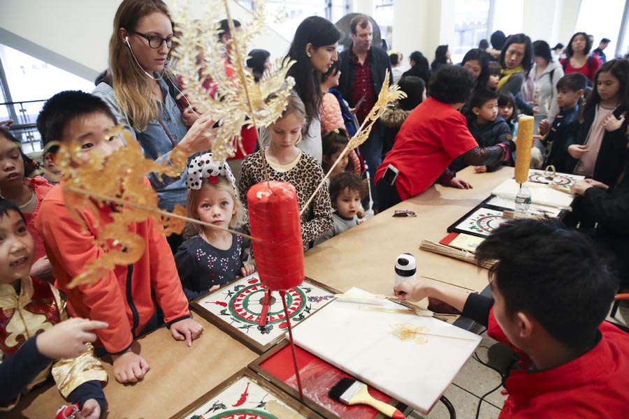Children watch craftsmen making sugar paintings during the students open day of "Happy Chinese New Year: Fantastic Art China" in New York, the United States, Feb 16, 2018. [Photo/Xinhua]