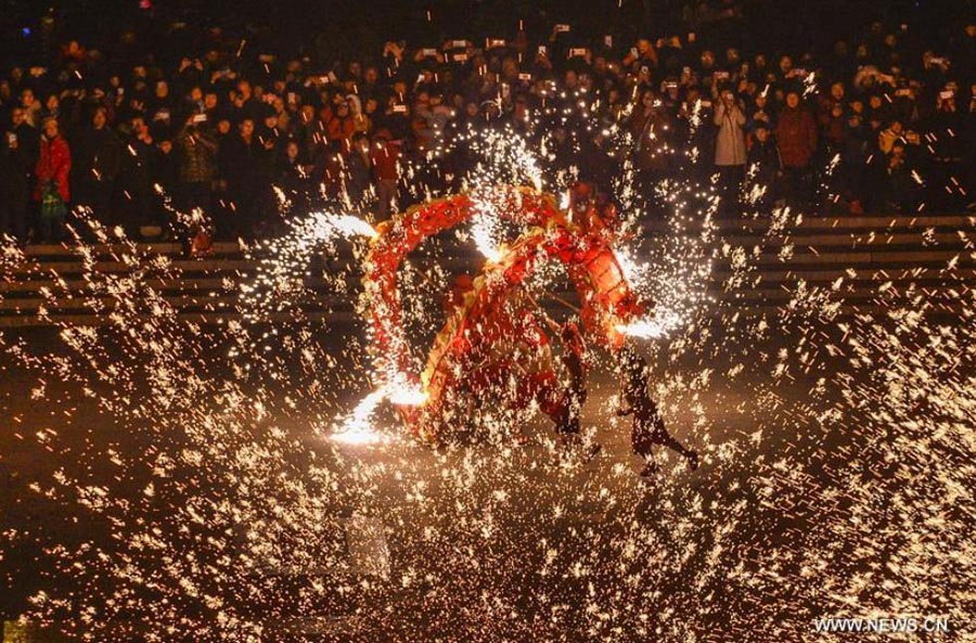 People perform a fire dragon dance in a shower of molten iron sparkling like fireworks to welcome the Spring Festival in Taierzhuang ancient town in Zaozhuang, East China's Shandong province, Feb 16, 2018. [Photo/Xinhua]