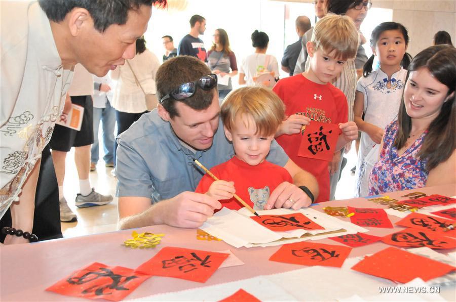 A boy learns to write Chinese calligraphy at the Asia Society Texas Center in Houston, Texas, the United States, on Feb 17, 2018. Asia Society Texas center in Houston held Chinese Lunar New Year celebrations Saturday afternoon with local Americans and Chinese participating in all kinds of activities and performances. [Photo/Xinhua]