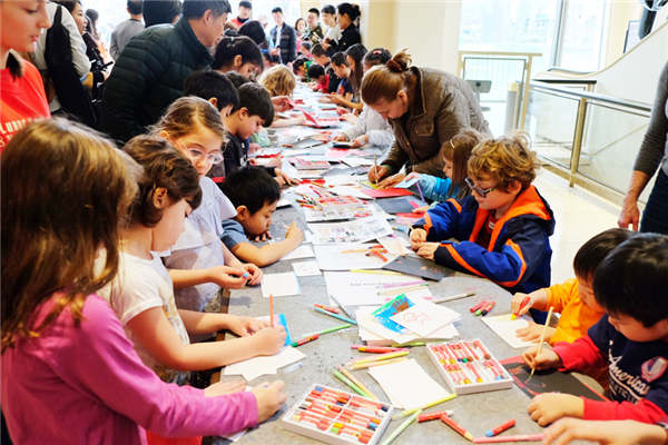 New York City public school students make artworks to be put into a 40-foot-long scroll of the five boroughs inspired by Qing Ming Shang He Tu, a painting in the Northern Song dynasty. [Photo by Judy Zhu/China Daily]