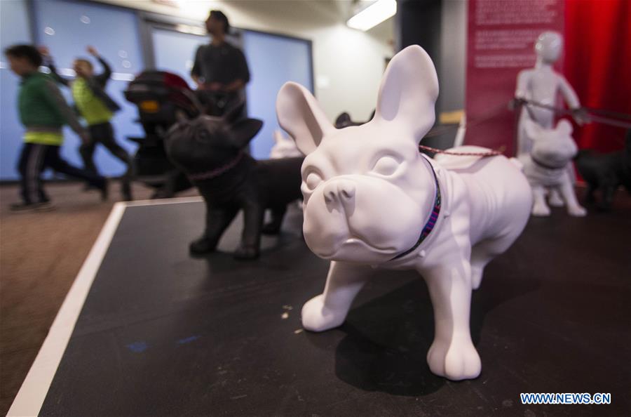 A group of dog statues are on display during the 2018 Lunar Fest at the Living Art Centre in Mississauga, Ontario, Canada, Feb 19, 2018. Featuring Chinese kung fu, lion dance performance and dog statues show, this event kicked off on Monday to celebrate the Chinese New Year. [Photo/Xinhua] |
