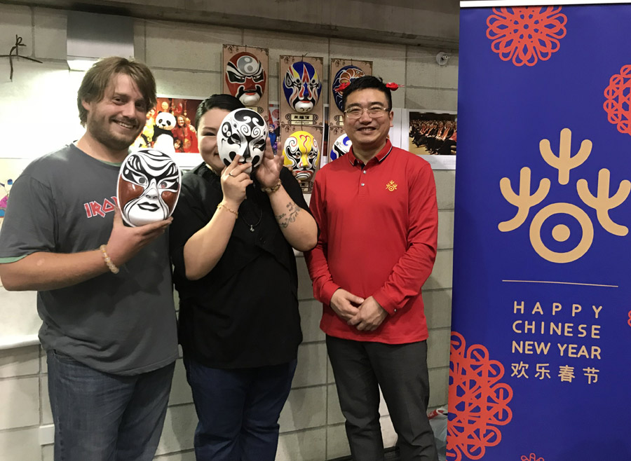 Two Peaking Opera mask painting aficionados in Auckland hold Peaking Opera masks as they pose for a photo with Yan Qun, the inheritor of Peking Opera mask painting, at the 2018 “Chinese New Year” Flower Fair at the Vodafone Event Centre in Auckland Feb 10, 2018. [Photo/Chinaculture.org]