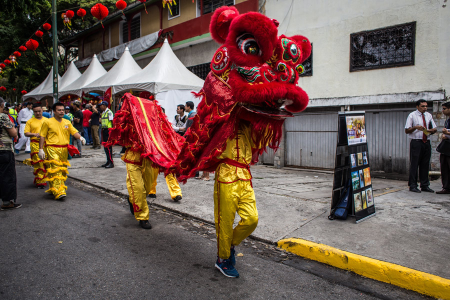 A group of Chinese lion dancing artists perform at the second Chinese New Year Temple Fair to celebrate the Year of the Dog in Caracas, Venezuela, Feb 18, 2018. [Photo/Chinaculture.org]