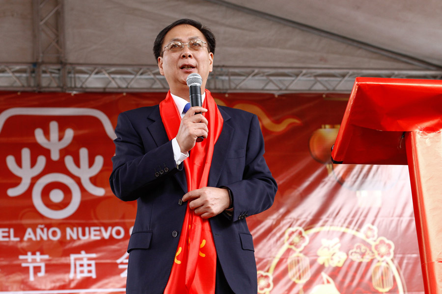 Li Baorong, Chinese ambassador to Venezuela, delivers a speech at the second Chinese New Year Temple Fair in Caracas, Venezuela, Feb 18, 2018. [Photo/Chinaculture.org]