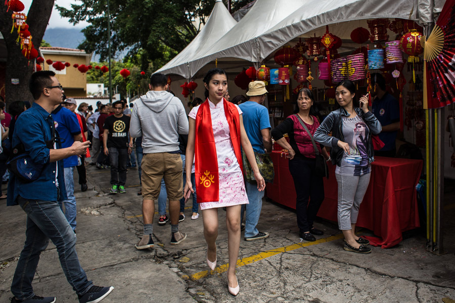 Li Baorong (center), China’s ambassador to Venezuela, watches the new year show with other guests at the second Chinese New Year Temple Fair in Caracas, Venezuela, Feb 18, 2018. [Photo/Chinaculture.org]