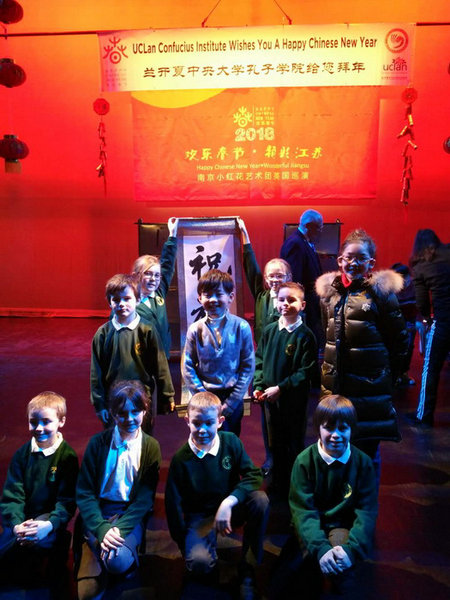 The young artists and local children pose for a photo in Preston, Britain, Feb 20, 2018. [Photo/Chinaculture.org]