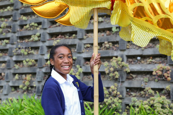 A student from the Wellington East Girls' School learning dragon dance techniques poses for a photo in a Confucius Class. [Photo/Chinaculture.org]