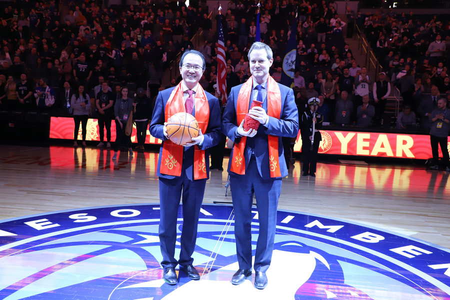 Hong Lei (left), Chinese consul general in Chicago and Ethan Casson, CEO of the Minnesota Timberwolves, exchange gifts before the game at Target Center in Minnesota on Feb 13, 2018. [Photo/Chinaculture.org]