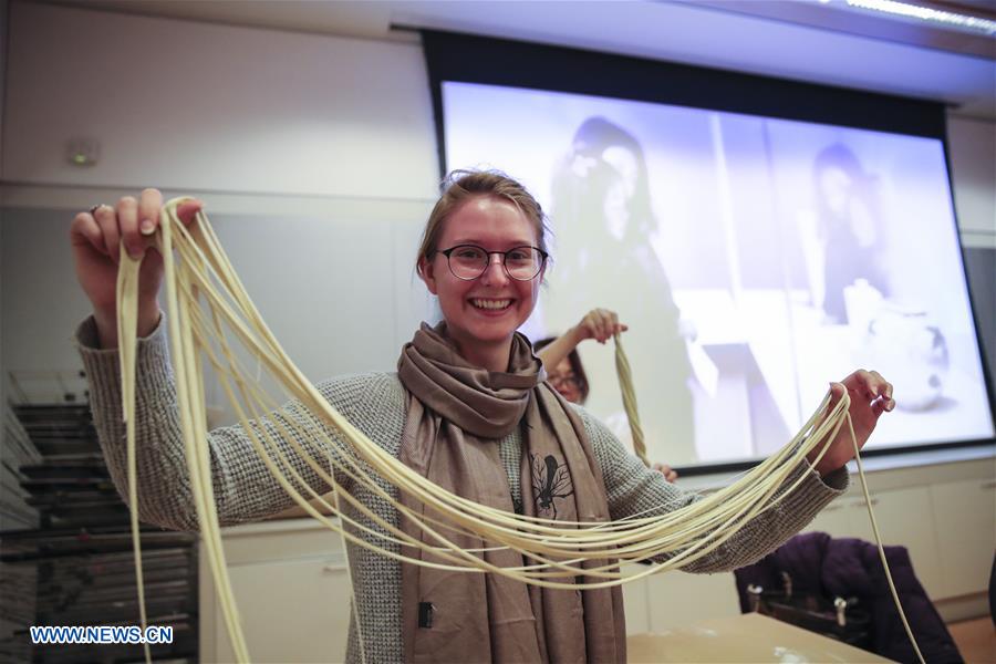 A visitor shows noodles she made after a hand-pulled noodle demonstration in a workshop of the "Lunar New Year Festival: Year of the Dog" at Metropolitan Museum of Art in New York, the United States, on Feb 24, 2018. [Photo/Xinhua]