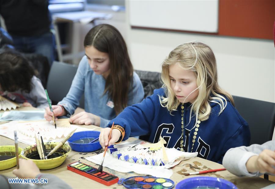 Girls paint Chinese fans in a workshop of the "Lunar New Year Festival: Year of the Dog" at Metropolitan Museum of Art in New York, the United States, on Feb 24, 2018. [Photo/Xinhua]