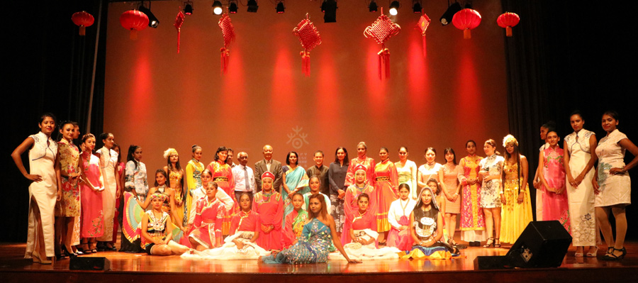 Teachers and students of different ethnic communities from the Mahatma Gandhi Institute wearing costumes of different Chinese ethnic groups pose for a group photo during the “2018 Happy Chinese New Year” celebration at the Mahatma Gandhi Institute in Mauritius, Feb 20, 2018. [Photo/Chinaculture.org]
