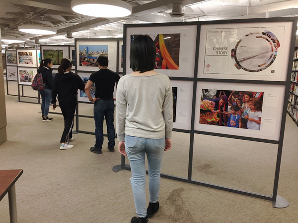 Viewers look at the photos at "The Chinese Story" exhibition at the University of Toronto, Feb 12, 2018. [Photo/Chinaculture.org] |