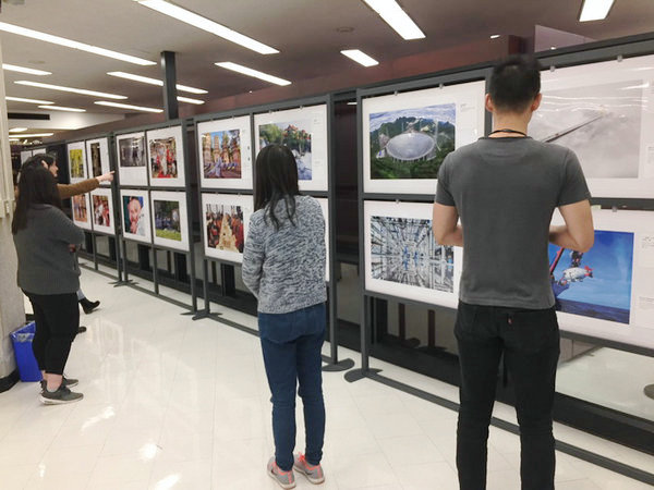 Viewers look at the photos on display at "The Chinese Story" exhibition at the University of Toronto, Feb 12, 2018. [Photo/Chinaculture.org]