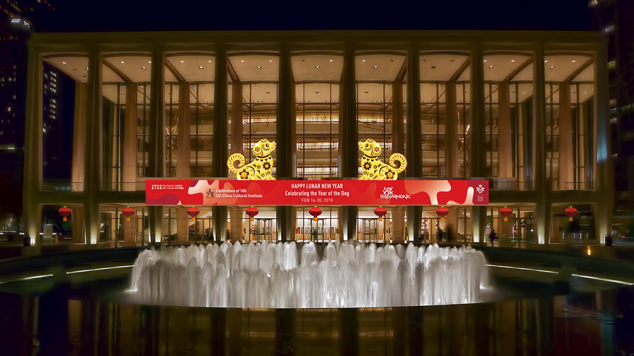 Lincoln Center in New York is decorated with a Happy Chinese New Year theme for the New York Philharmonic’s annual Chinese Lunar New Year concert, Feb 20, 2018. [Photo/Chinaculture.org] |