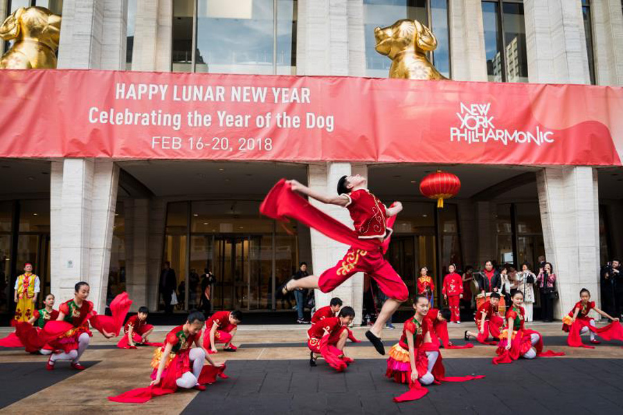 Students from the National Dance Institute perform Chinese folk dances before the concert outside Lincoln Center in New York, Feb 20, 2018. [Photo/Chinaculture.org]