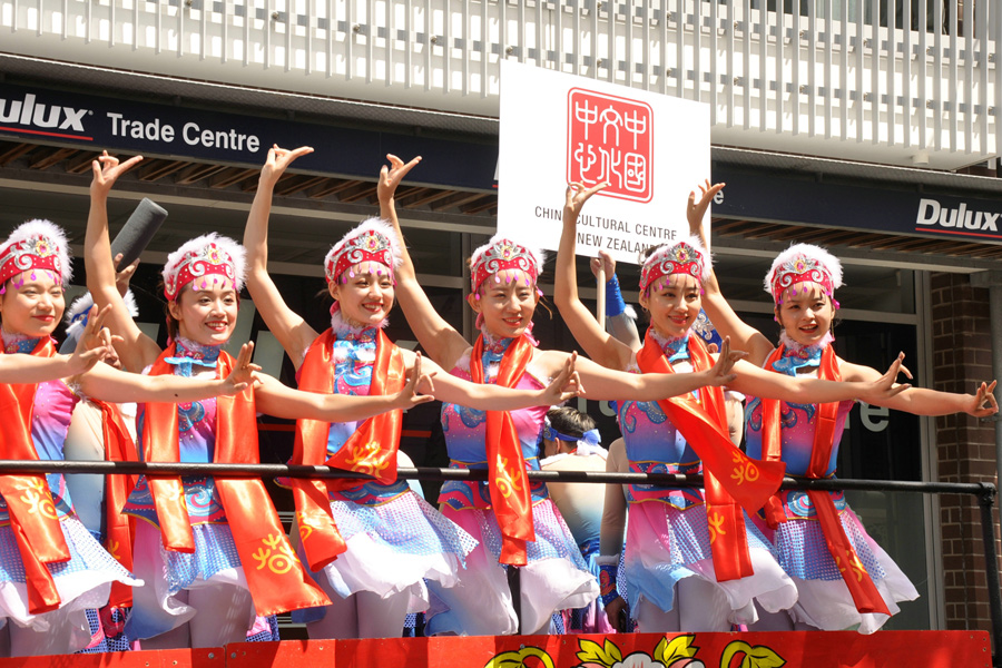 Guo Zongguang, director of the China Cultural Center in New Zealand and Jill Day, deputy mayor of Wellington, were on the first float heading the parade, waving to the visitors to extend new year greetings.