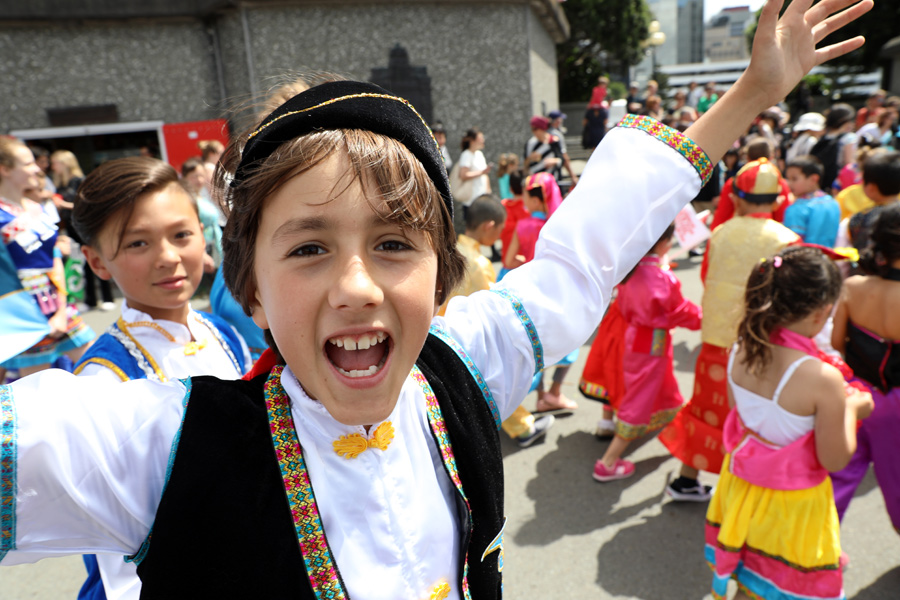 A New Zealand student in the Chinese ethnic group costume wears a radiant smile at the “Happy Chinese New Year” parade in Wellington on Feb 17, 2018. [Photo/Chinaculture.org]