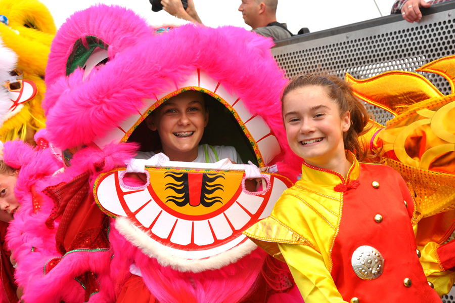 Two students from the Wellington East Girls’ School performing dragon and lion dances pose for a photo at the “Happy Chinese New Year” parade in Wellington on Feb 17, 2018. [Photo/Chinaculture.org]