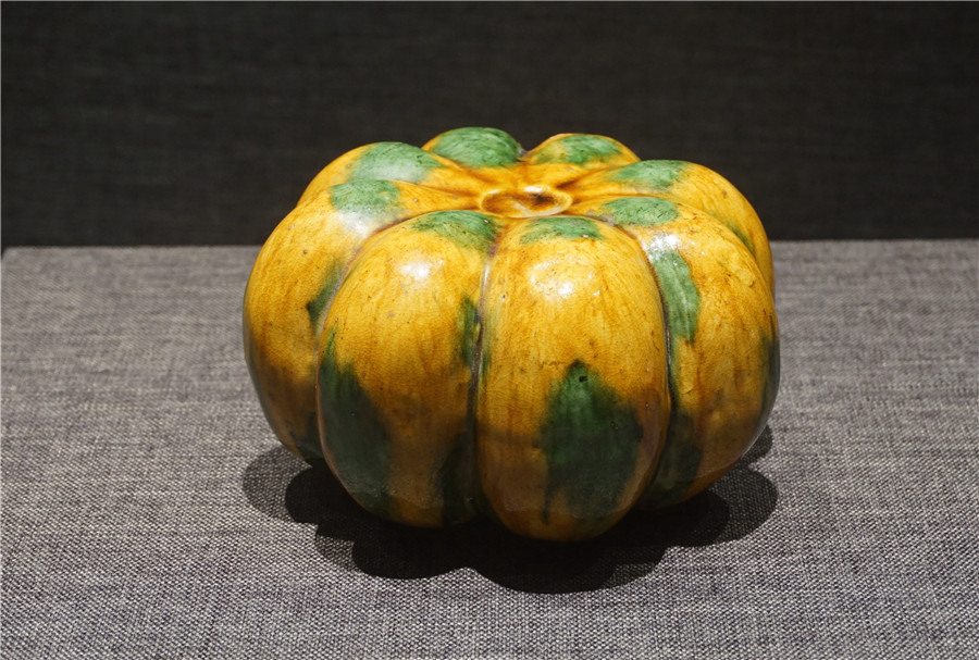 A pumpkin-shaped Tang tricolor glazed ceramic piece is displayed at the Zhejiang Provincial Museum in Hangzhou, Feb 27, 2017. [Photo by Long Wei/Asianewsphoto]