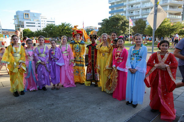 Locals dressed in various Chinese traditional costumes celebrate the Chinese New Year at the third "Light Up Newcastle" at Harbor Square in Newcastle, Australia, Feb 24, 2018. [Photo/Chinaculture.org]