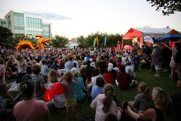 Visitors watch the performances at the third "Light Up Newcastle" at Harbor Square in Newcastle, Australia, Feb 24, 2018. [Photo/Chinaculture.org]