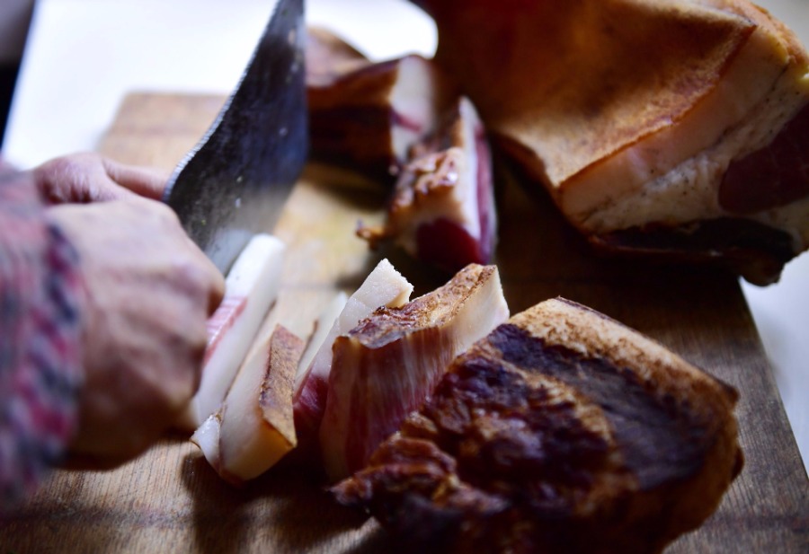 A villager prepares preserved meat at Huoshaoying village of Xuan'en county, Central China's Hubei province, March 14, 2018. Local people of Tujia ethnic group usually make "Shefan", a traditional food made of glutinous rice, preserved meat, artemisia annua, green onion and other vegetables, in the early spring time.[Photo/Xinhua]