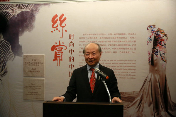Zhan Yongxin, Chinese ambassador to Israel, addresses the opening ceremony of In Praise of Silk, Fashion with Tradition in China at the Chinese Cultural Center in Tel Aviv on March 13, 2018. [Photo/Chinaculture.org]