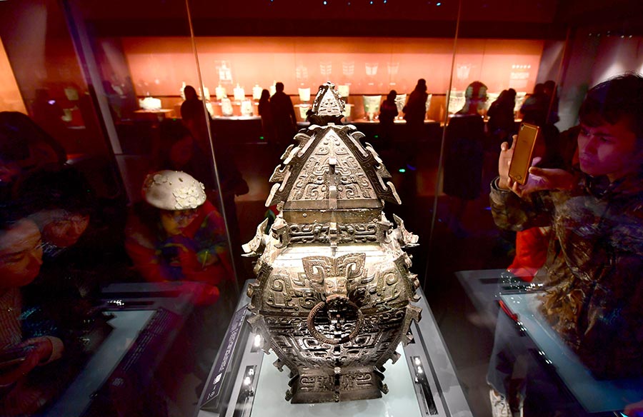 The "Min er quan" Fanglei is a bronze wine vessel unearthed in 1919 at Taoyuan county, Central China's Hunan province. The container, with varied carving techniques, impressed people with its elegance and solemnity and was thus hailed as "king of all fangleis". It was also considered a representative work of the Shang Dynasty (1600 BC-1046 BC), the peak of Chinese bronze culture.