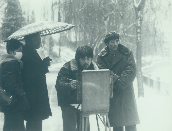 Zhao Wenliang (right) and Yang Yushu (second right) paint at a Beijing park in the winter of 1985. [Photo provided to China Daily] |